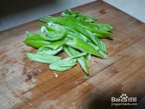 清洗干净的青椒,对半切开,取出里面的辣椒籽,切成小菱形方块。