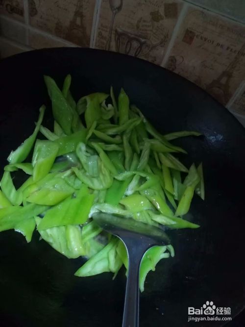 锅中加入适量的花生油和少许的食盐,油温升至五成热之后,将切好的青椒倒入锅中。