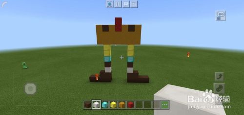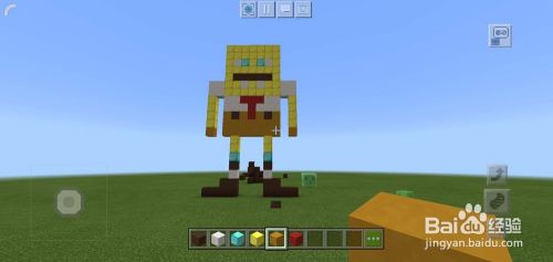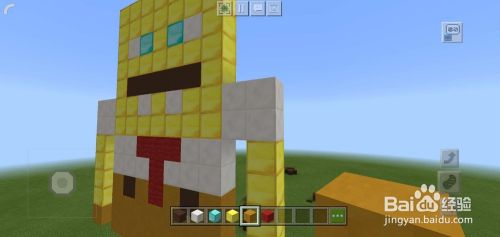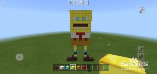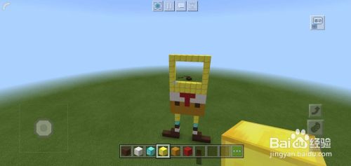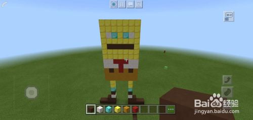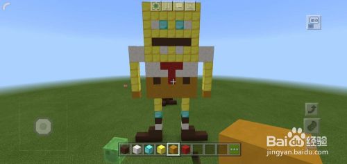接着搭配“石英”、“金块”和“棕色陶瓦”,建造海绵宝宝的袜子和腿部,选择“黄色陶瓦”,我们建造海绵宝宝的裤子;