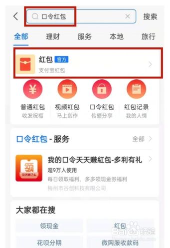 1、打开支付宝,搜索窗口输入口令红包,选择官方的红包。