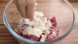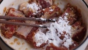 腌制好的排骨挑去生姜,加入适量淀粉搅拌均匀。使每一块排骨都均匀裹上干淀粉。