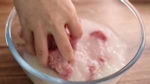 将排骨倒入盆中,加入1把面粉,用手抓1分钟左右。稍微有一点粘手的状态就可以了,面粉吸附能力比较强,可以更快速地把排骨洗干净。