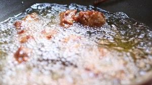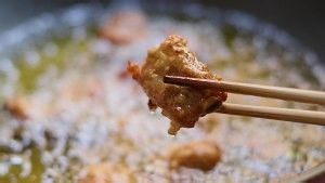 锅里放入适量食用油,油温6成热时将排骨依次下锅。中途多翻面,使其受热均匀,炸至两面金黄,夹起来控油。