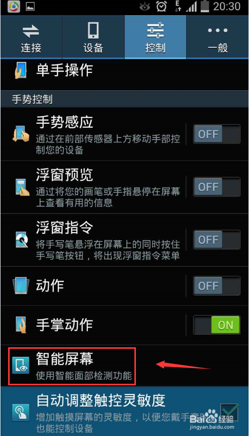 第四步:进入手机设置,控制页面以后,点击智能屏幕一项,进入智能屏幕设置页面