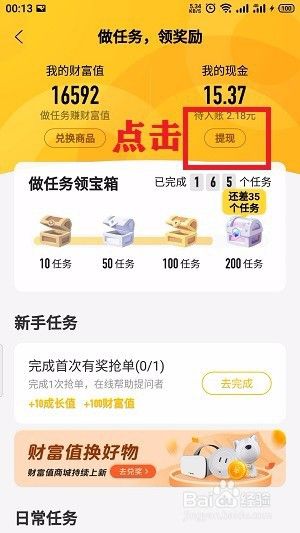 进入之后会看到我的财富值、我的现金以及各种日常任务,点击“提现”;