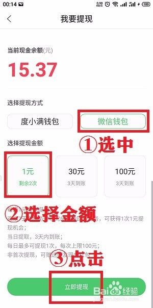 在我要提现页面,选择提现的方式有“度小满钱包”和“微信钱包”两种方式,这里以微信钱包为例,选择提现金额有“1元”“30元”“100元”,每天最多提现一次单次最多100元,选中1元,点击“立即提现”;