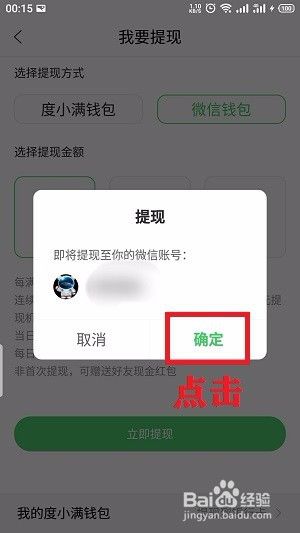 弹出对话框提示“即将提现至你的微信账户”点击“确定”;