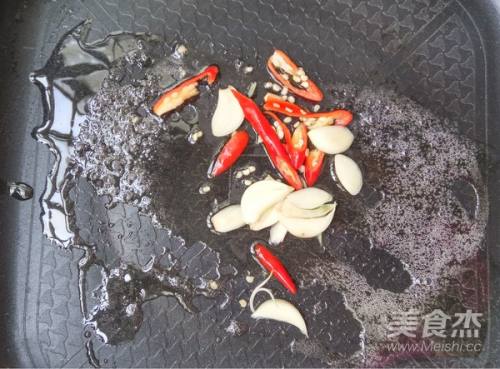 热锅倒油,下蒜片、小米椒爆香
