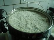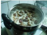 上蒸锅,蒸锅水烧开后,均匀地铺上一层揉搓好的粉,然后在上面再添加一些核桃仁、蜜枣,开锅蒸。