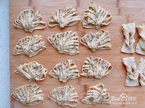 取一个小面皮,对折,在中间切上十几刀,然后把切好的面皮展开,斜角对折捏在一起,把另外两个角也捏在一起,一上一下,这样一个炸麻叶的生胚就做好了