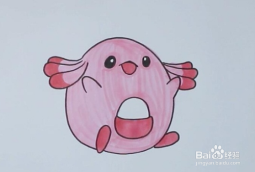 补充画出吉利蛋的另一只耳朵后,画出肚子上的口袋,并将眼睛涂黑。