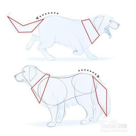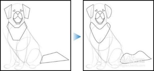尾巴沿着从腰部下降的坡度绘制。根据品种的不同,长度和体积会赋予其个性。金毛猎犬的尾巴蓬松,因此最好夸大凸起。