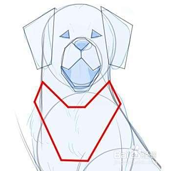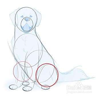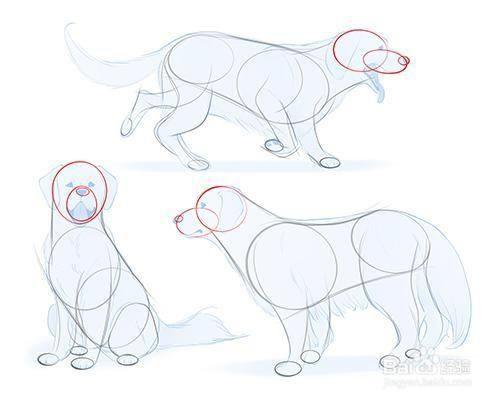 首先,画一个将成为头骨的圆。猎犬(例如金毛猎犬)的头骨来回拉长。连接躯干和头部后,画出使下巴成椭圆形的椭圆。