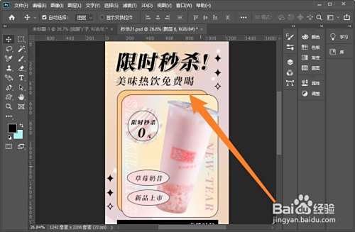 商品原价的秒杀海报可以在PS中设计。以下是具体操作步骤: