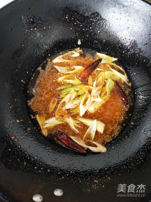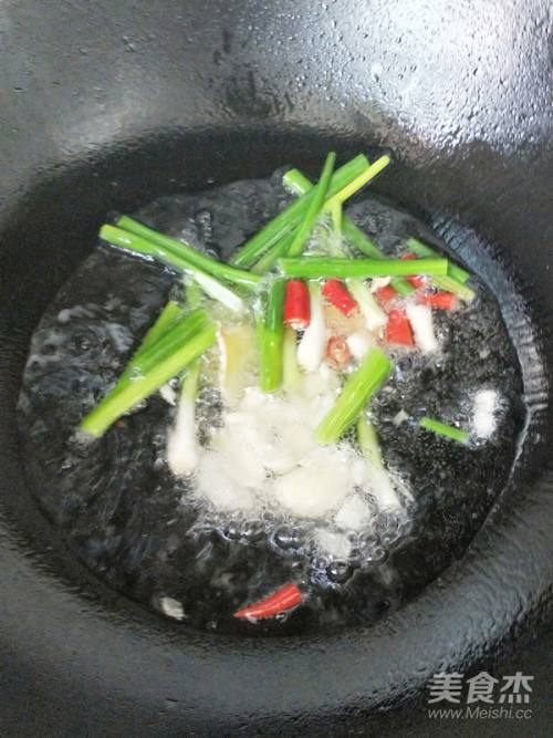 4铁锅油烧热 放入葱段,蒜瓣,小米辣,辣皮