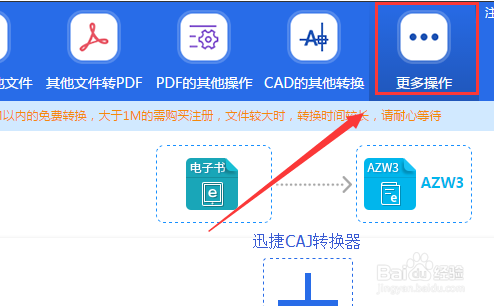 我们看到软件最上方的几个栏目,我们点击“更多操作”。接着点击软件左侧的"AZW3"。