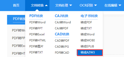 打开pdf在线转换器官网,点击主页上方文档转换里面的“转成AZW3”,这时候就进入了转换页面。