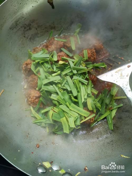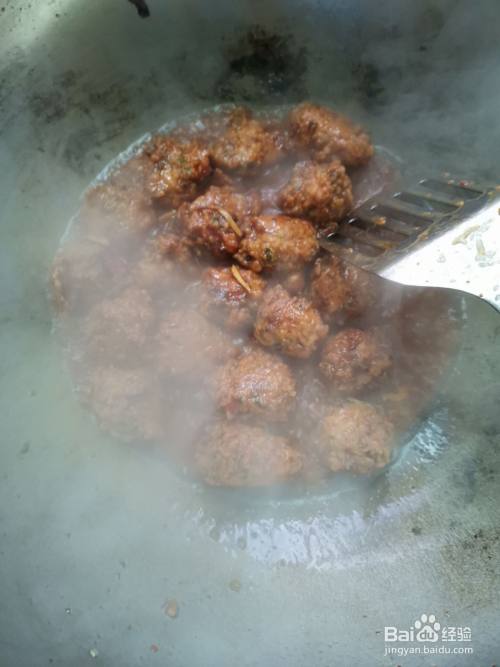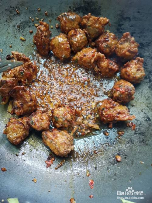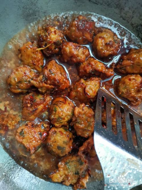 锅中热油六成热时,放入豆瓣酱和姜蒜沫爆香,再加入丸子炒匀。