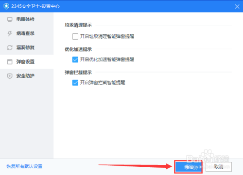 【6】当“开启垃圾清理智能弹窗提醒”前方框中的勾取消后,点击“确定”按钮即可完成设置。