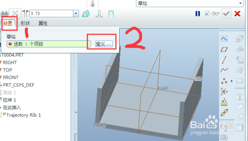 系统打开如下所示的“筋”控制面板,点击“参照”(step1),然后点击“草绘”后面的“定义”(step2)。