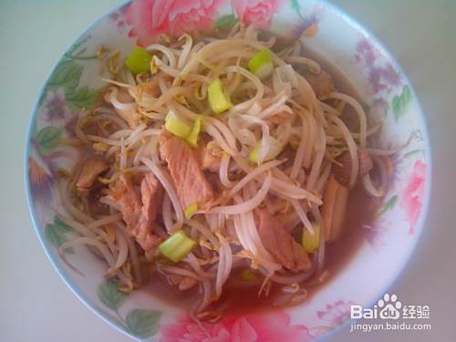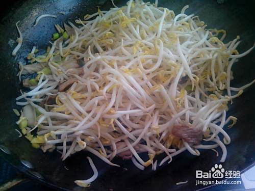等肉丝炒的差不多是放入香葱末和姜末,继续炒香后再放入绿豆芽开始翻炒。
