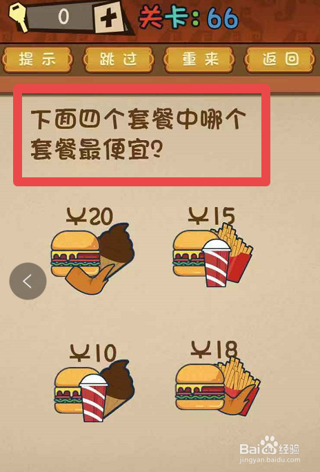 在第六十七关内,需要我们在底部的四个套餐中找到哪一个套餐是最便宜的。