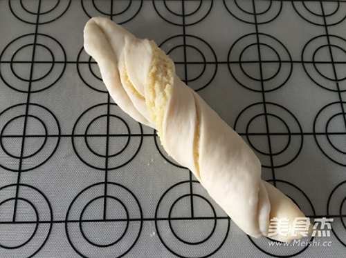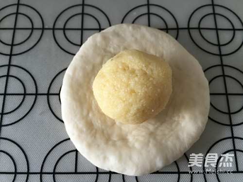8取一个面团按扁,包入椰蓉