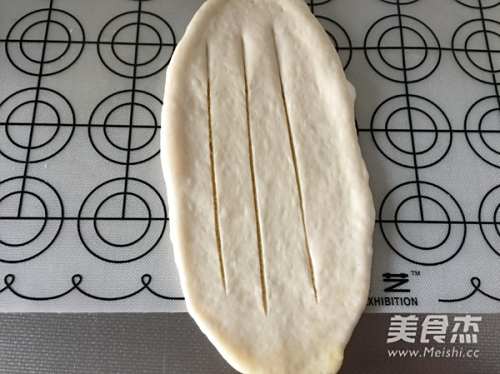 9擀成长方形,划上三刀,不要切断