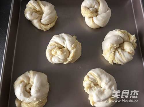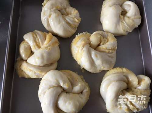 11面团打个结,放入烤箱进行第二次发酵,发酵到2倍大
