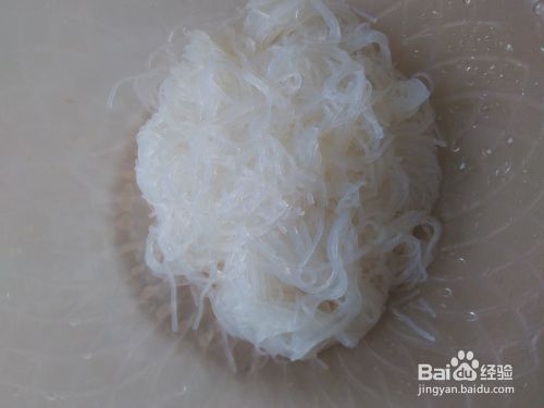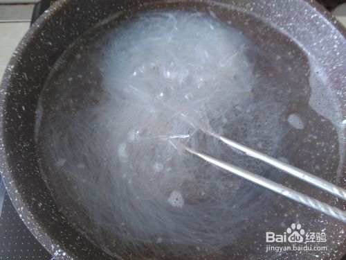 锅装适量的水煮沸,放粉丝进去灼1分钟左右,捞上来沥干水分备用。