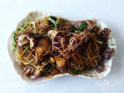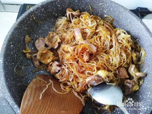 3、再开火放鸡胗进去,翻炒煮至熟透,然后放回粉丝混合一起翻炒至熟即可。