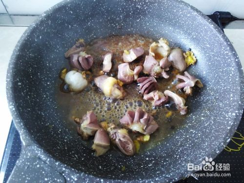 再开火下油,放腌制好的鸡胗进去,饭炒至变色,然后下10毫升左右的水进去。