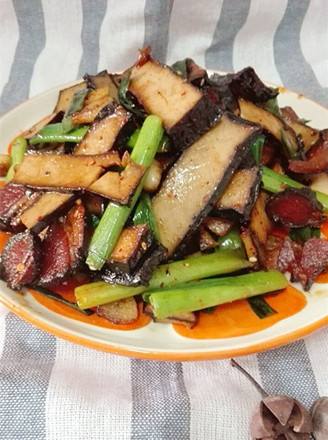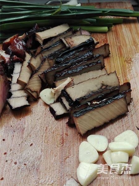 香干和腊肉切片,蒜苗洗净切段,蒜子切片备用
