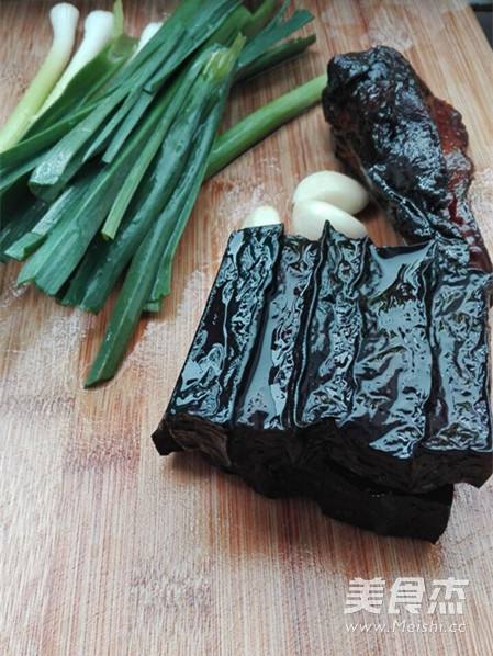 准备好材料,柴火香干一块、腊肉和蒜苗少许、蒜子3粒