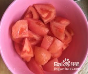 西红柿洗干净之后放进开水里煮5分钟,然后去皮,切成小块,用盘装好备用。注意要把西红柿的蒂去除。