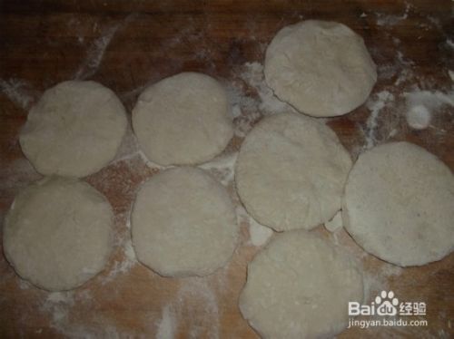 把刚才的小剂子,搓圆后放在左手上,用右手把小剂子压扁,要求中间厚,边上薄,在中间放入白糖,用右手像包包子那样将边卷起来,捏好揉圆放在面板上压成小饼状.