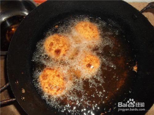 做完了糖糕,就可以开火炸了,把油倒入锅中,开中火烧到五成热,在这跟大家说一下,油温太低的话,炸出来颜色会发白,油温太高可能外面炸好了,里面还没熟透容易炸黑,油温一定掌控好,下锅开炸啦.