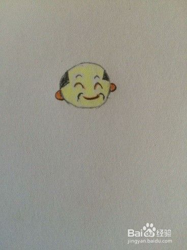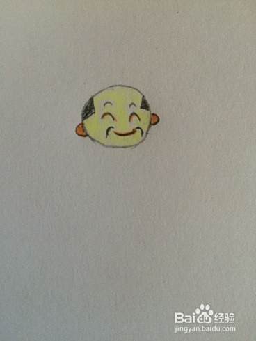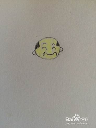 如图,用浅黄色彩铅把老人的面部涂上颜色,很亮堂的感觉。