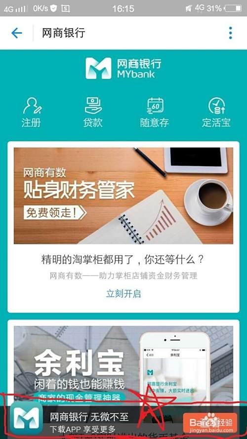 首先,我们需要在手机上下载网商银行APP(支付宝界面就有)!通过在支付宝APP中“支付宝--我的”页面找到网商银行,点开自己下载一个网商银行,然后注册或者用支付宝账号登录都可以!
