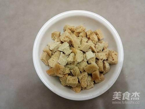 5焯过水的烤麸反复挤压洗净,并撕成小块。