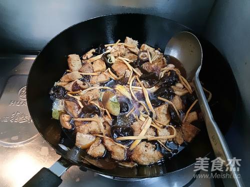 10加入所有食材后翻炒一下,加入3茶匙老抽,适量生抽、冰糖。