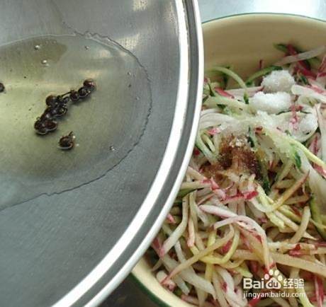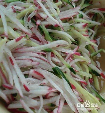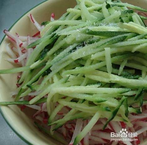 黄瓜洗净礤丝,水萝卜丝放入盆中,加少许盐拌匀腌一会儿。