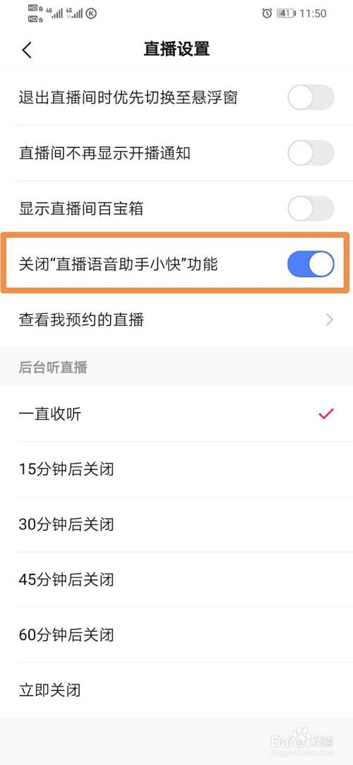 最后点击【直播设置】,按【关闭直播语音助手小快功能】右边白色按钮,开启即可。
