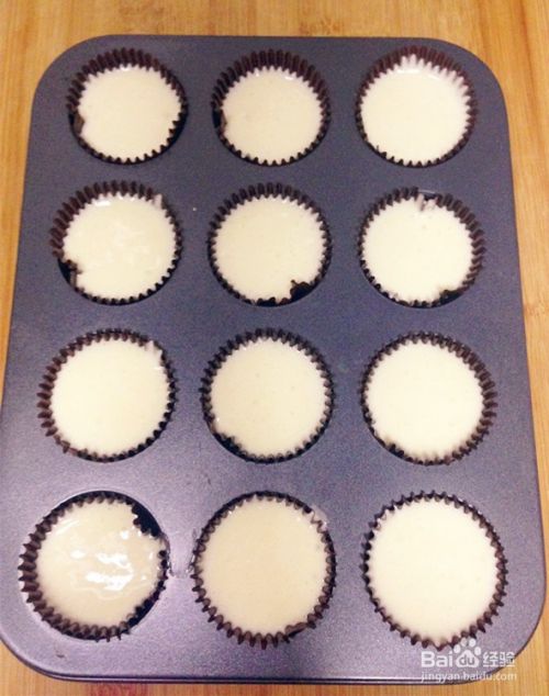 将加工好的鸡蛋面糊逐个倒入纸托中,8分满即可。