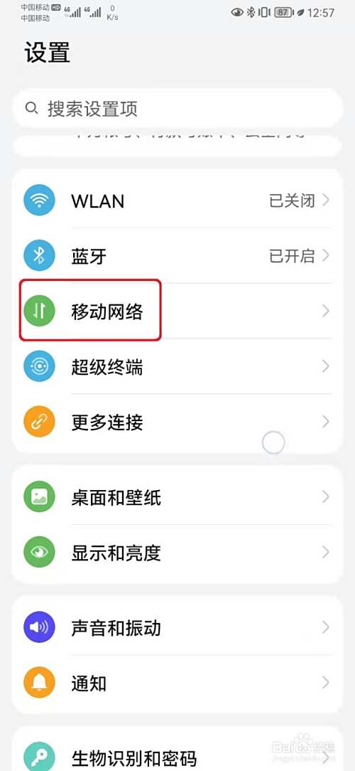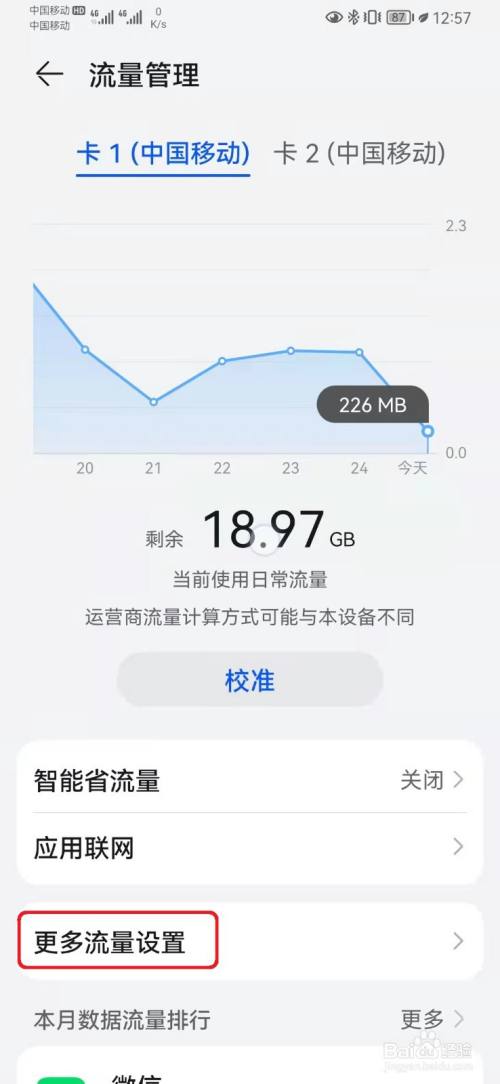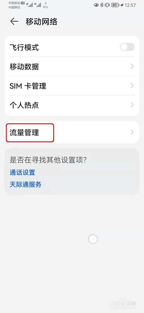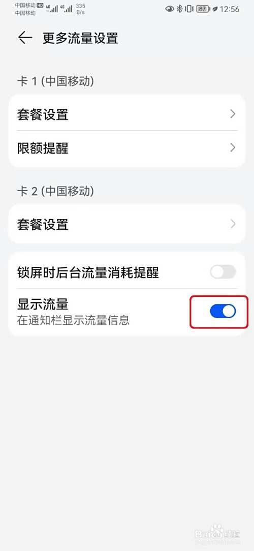 在华为手机上通过移动网络的流量管理,开启通知栏显示流量数据的方法。