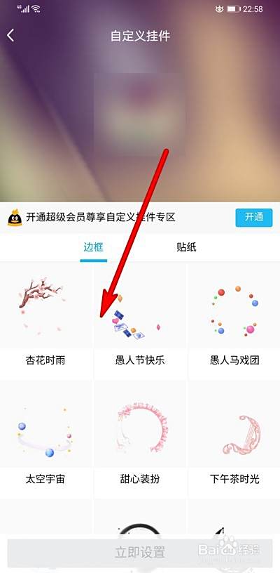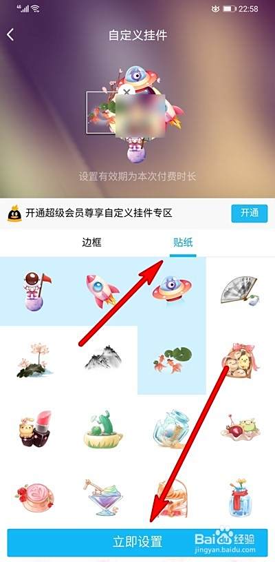 点击贴纸,可以在这个界面设置贴纸。选择好之后点击底部的立即设置。