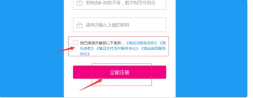 同意服务条款,然后点击”立即注册“,注册成功即成为了唯品会的会员。
