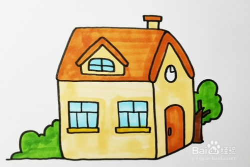 最后将墙面涂上黄色,草丛和树叶都涂绿,简单又好看的房子就画好了。