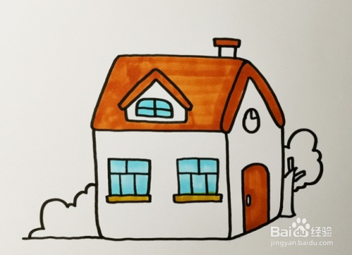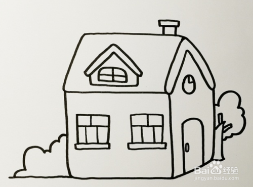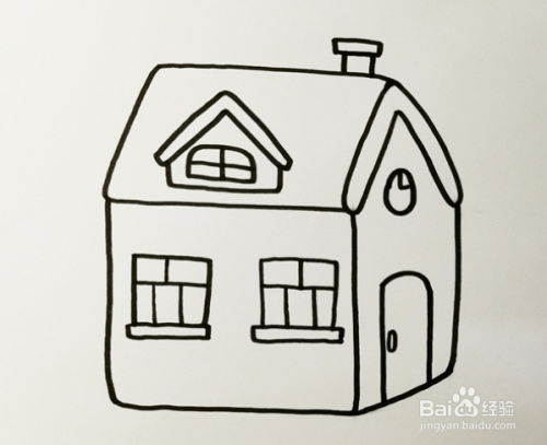 在房顶上画出烟囱,和阁楼的窗户,还要在墙上画出两扇窗户以及一扇门出来。