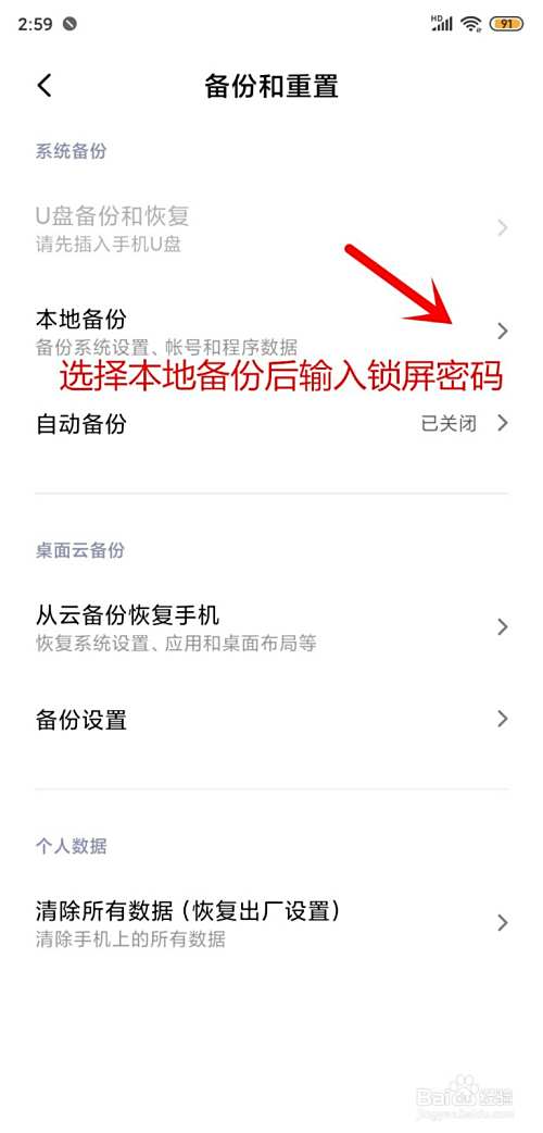 3.进入备份和重置页面后,选择【本地备份】并输入锁屏密码查看之前的系统备份数据;